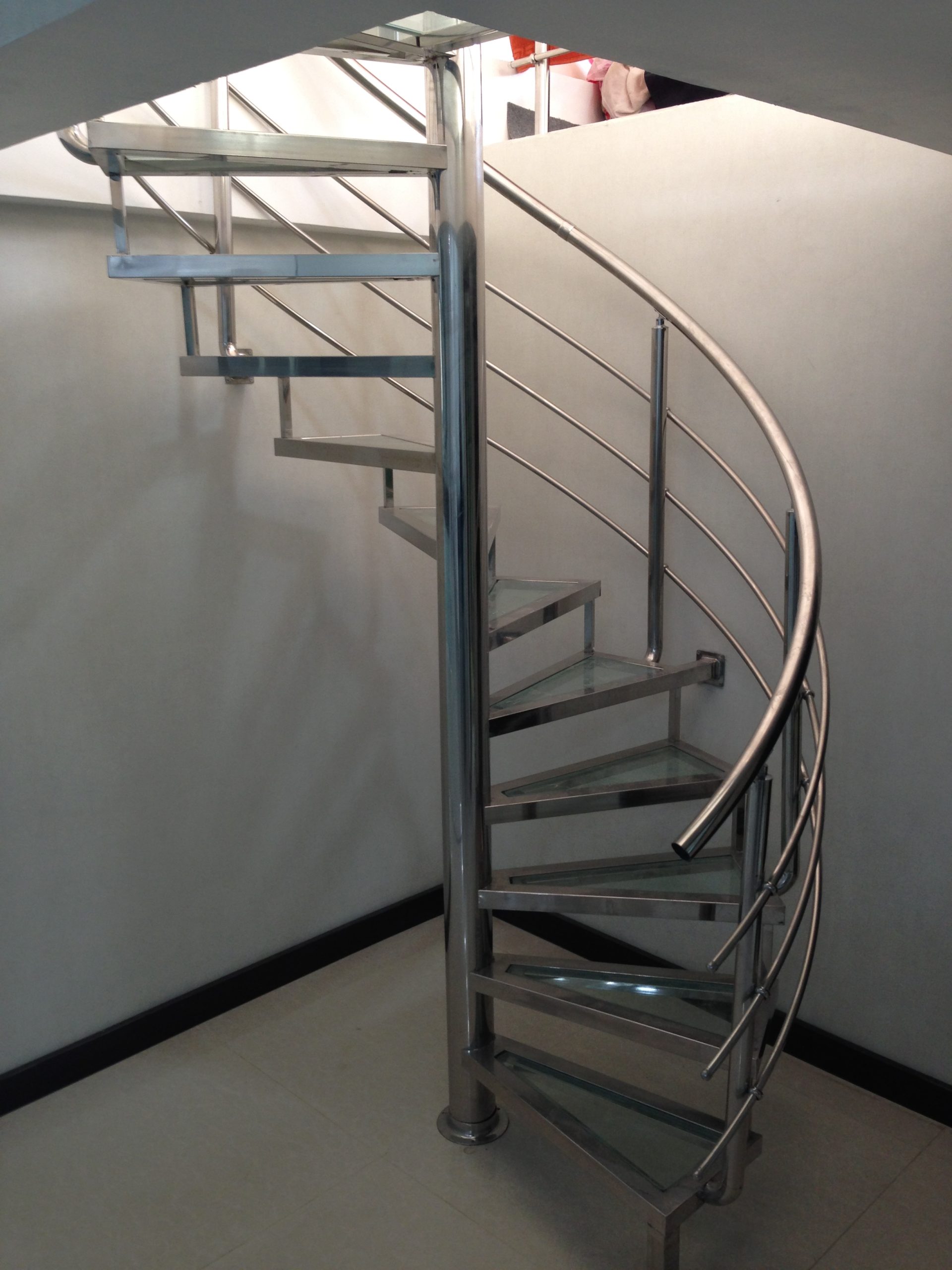 پله استیل حول محور یا اسپیرال مناسب فضاهای کوچک است. جنس ستون اصلی می تواند لوله استیل مقاوم و یا لوله آهنی باشد. چهارچوب پله ها نیز پروفیل استیل یا آهن است.